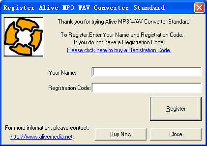 Please enter Your Name and Registration Code, and then click Register to registry Alive MP3 WAV Converter.