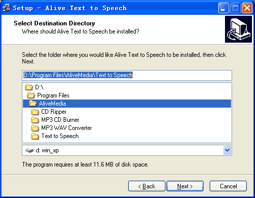 Select the folder where would like Alive Text to Speech to be installed, the click Next.