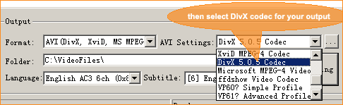 - Clikc on the drop-down lists, and select your output format as "AVI (DivX,